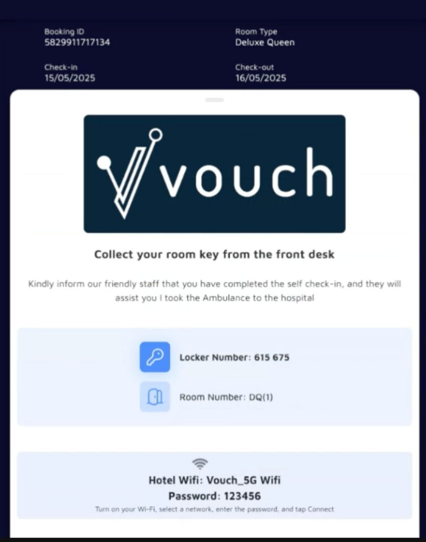 After completing the check-in flow and ID verification, the system will generate the code and present it to the guests. An email will be sent with the details as well.